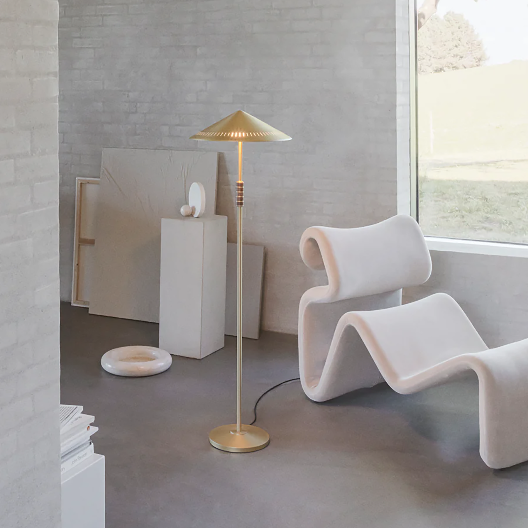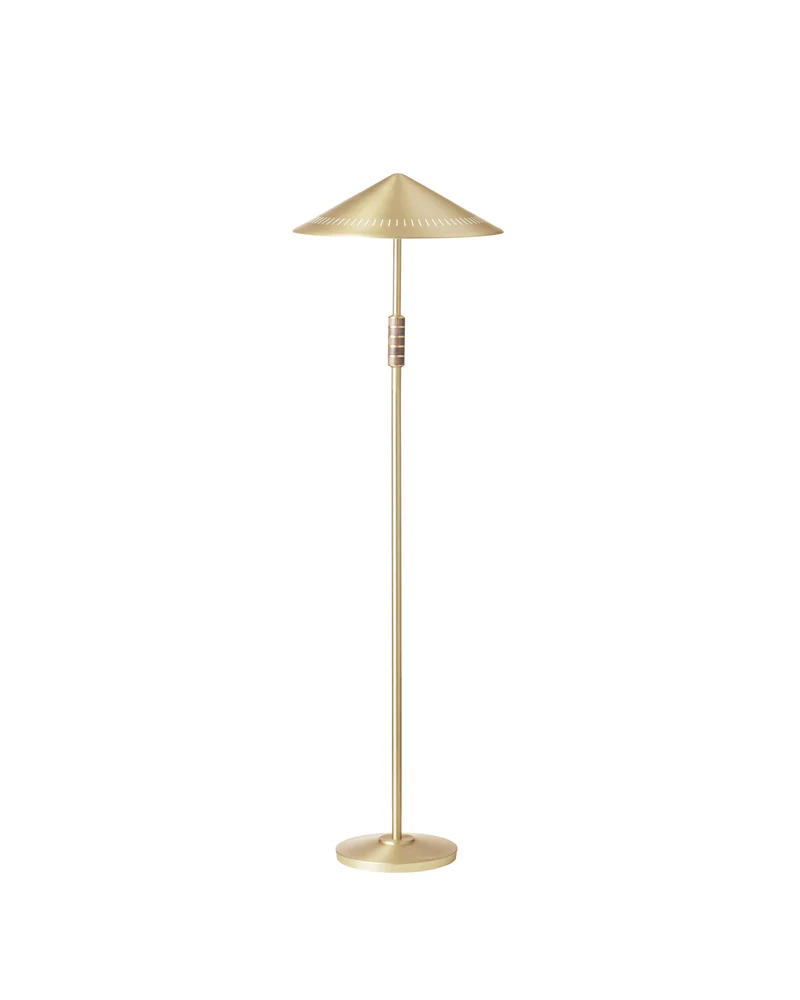 その名の通り権威や厳格さを象徴するようなイメージをもつ「GOVERNOR」はオフィシャルな空間にもマッチするテーブル・フロアランプのシリーズです。 極限までに浅く設計された真鍮製のシェード内には2灯の光源を横向きに配置。効率よい内面の反射によって均一で心地よい拡散光をもたらし、シェードの縁に沿って施されたスリット(パンチング)が規則的な光のパターンとして浮かび上がります。ここでベント・カールビーが掲げたテーマ「ソリッド」とは、素材、形状、色といった要素がその違いを超えて共鳴し一体となることを意味します。全体を通して均一な仕上げや、真鍮無垢とウォルナットという異素材のコンビネーションで構成されたグリップは、まさにこのテーマを具現化しています。