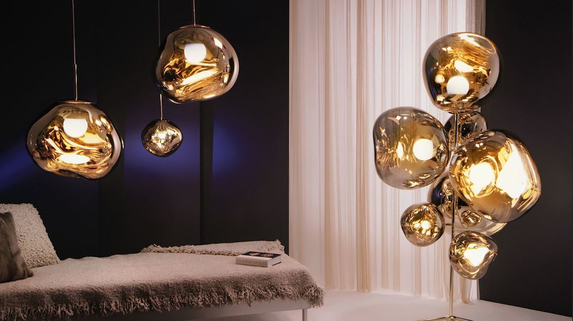 溶鉱炉で熱せられ、膨らんでいく吹きガラスのように、一見生命体のような意匠が特徴の「MELT(メルト)」。 見る角度によって形が違って見えることから、ハンドメイドのガラス製品のように見えますが、シェードは射出成型されたポリカーボネートでできています。 シェードの中は特殊な真空蒸着によって塗装され、シェード上部から底部にかけて塗装の濃度を段階的に変えることで、点灯時には、物体が溶けるような視覚効果を生み出し、消灯すると空気を漂う鏡面のオブジェへと変化します。 天井高が低い環境でも、ラグジュアリーなシャンデリアの意匠を楽しむことができます。