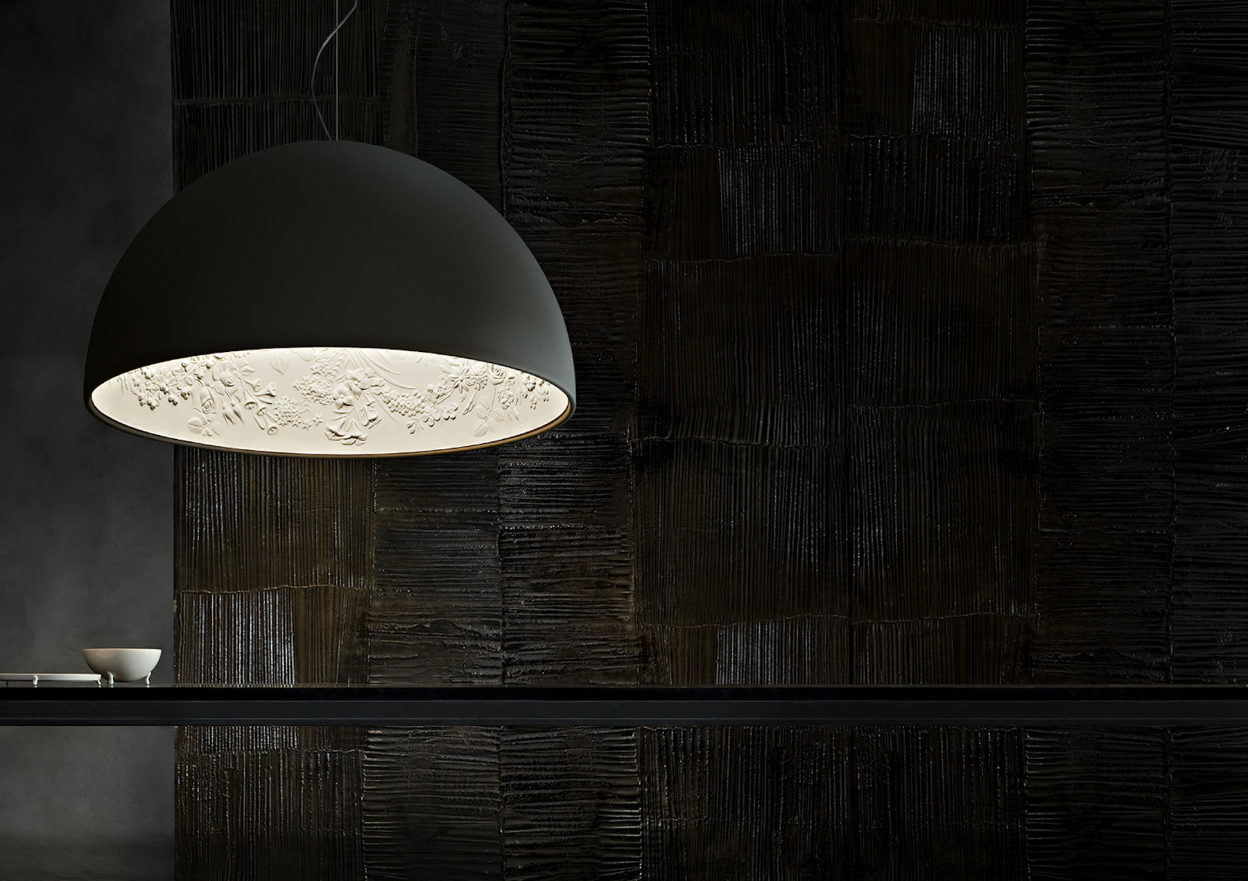 FlosのSkygardenは、デザイナーのマルセル・ワンダースによってデザインされたペンダントライトです。この照明は、名前の通り「空の庭」をイメージしたデザインが特徴的で、外観はシンプルでモダンなドーム型ですが、内側には美しい装飾が施されています。 内側の装飾は、古い装飾天井にインスピレーションを得た繊細な彫刻で、花や植物のモチーフが漆喰のように立体的に描かれています。光がランプから照射されると、この彫刻が柔らかい影を作り、温かみのある雰囲気を空間に与えます。Skygardenは、クラシックな美しさと現代的なシンプルさを融合させたデザインで、どんなインテリアにも調和し、特別な存在感を持たせます。 サイズや仕上げは複数あり、ブラック、ホワイト、ゴールド、ブラウンといったカラーオプションが揃っているため、空間や好みに合わせて選ぶことが可能です。Skygardenは、アートと機能性を融合させた照明として、空間にエレガントで夢のような魅力を提供します。